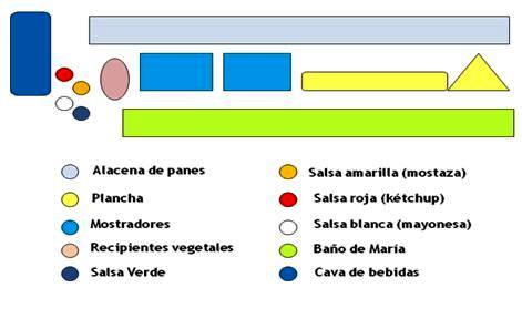 Se precisan diversos espacios, a) Los secos; donde se almacena y guardan los alimentos e ingrediente que requieren de poca humedad para su conservación, b) Calientes; son aquellos donde se almacenan alimentos que requieren de una temperatura medianamente alta, y en este se ubican los de tratamientos térmicos ya sea por contacto directo o a través de vapor. Son aquellos que permiten la cocción de la carne, jamón y quesos. c) Los fríos; incluyen tanto el almacén de las bebidas como la de los productos que requieren refrigeración, tal como los de origen proteicos.