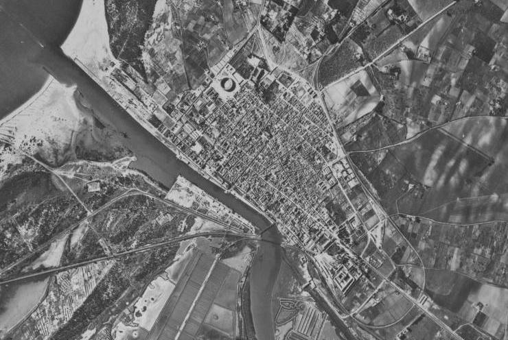 Ilustración 2. Vista aérea de principios de la década de los cincuenta. Es fácil distinguir la plaza de toros y comprobar que el casco urbano tenía los mismos límites que en el plano de Palacios (1865).