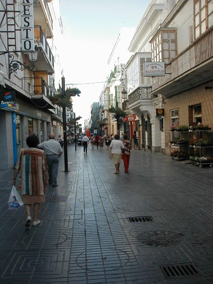 Ilustración 8. Vista general de la calle más céntrica de la localidad (calle Luna) peatonalizada y despersonalizada. El pavimento, que ha sustituido al adoquinado tradicional al igual que ha ocurrido también en parte de la calle principal (calle Larga), y el ornamento de macetas aéreas parecen decorar cualquier tramo de cualquier paseo marítimo de cualquier localidad costera.