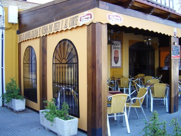 Ilustración 20. La recreación de la arquitectura en este bar, recién restaurado, muestra todo su esplendor cuando, al anochecer, se desenrollan los toldos transparentes y éstos tienen pintado un enrejado típico andaluz para que los turistas disfruten bajo plástico del límpido aire de la Bahía de Cádiz.