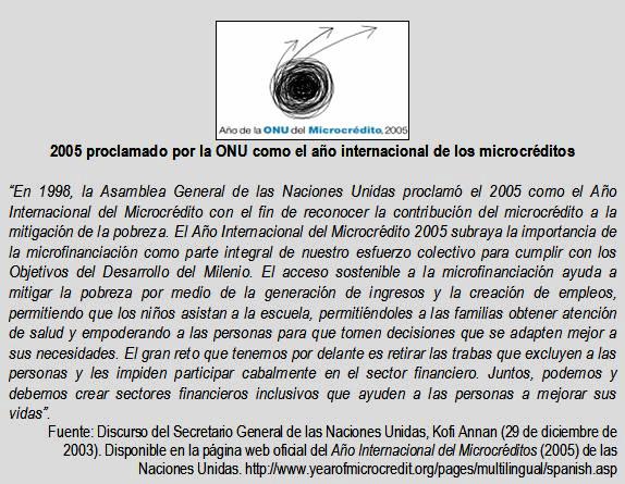 Sin embargo, en la interpretación dominante contemporánea se (re)conciben explícitamente estos programas de microfinanzas con un fundamento novedoso y eficaz (Naciones Unidas 1998), lo que ha contribuido a levantar un interés y una euforia inusual dentro y fuera del mundo de la cooperación, de lo que hacen uso de manera pomposa medios de comunicación y personas públicas de todas las áreas sociales (11).