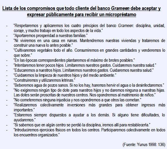 “Después de observar estas experiencias y el camino recorrido por las ideas del Grameen en África, Asia, Europa y Norteamérica, llegué a la conclusión de que las condiciones culturales, geográficas y climáticas pueden variar, pero los pobres tienen los mismos problemas en todos los rincones del planeta. La cultura de la pobreza, esa prisión donde la sociedad encierra a la gente, transciende la diferencia de lenguas, razas y tradiciones. Por esta razón el microcrédito puede tener una aplicación casi universal. Me he convencido de que el crédito es una herramienta universal que desbloquea las capacidades humanas. Nuestra experiencia, desde el Ártico a los Andes, desde Chicago a China, demuestra que el éxito del modelo Grameen no se sustenta exclusivamente en la cultura de Bangladesh” (Yunus 1998: 224).