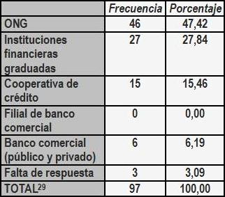 Por estos datos la utilización de las expresiones “monetarización” o “bancariosfera” de la pobreza en la sociología del desarrollo (Gómez Gil 2005: 13) deben utilizarse con precaución y mucha distancia. Estos neologismos contrariamente a lo que en un principio se podría afirmar, en el caso de los microcréditos para el desarrollo, no permiten inferir que se haya iniciado una tendencia significativa al downscaling (creación de departamentos de microfinanciación de un banco comercial) o al upscaling (transformación de unas ONG en microbanco comercial). Un ejemplo muy significativo se encuentra con el banco comercial Santander, el cual tiene una presencia bancaria “tradicional” muy extendida en América Latina, pero interviene con poca frecuencia en operaciones de microcréditos. Y este ejemplo podría extenderse en muchos otros países como Francia o España (Attali 2005).
