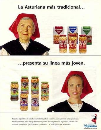 Analicemos ahora un anuncio, con el fin de ejemplificar lo que hasta ahora se ha dicho de forma más o menos teórica. El anuncio de la Fabada Asturiana es claro y su configuración sencilla: dos mujeres, una anciana (esquina superior izquierda) y una joven (esquina inferior derecha) vestidas con el traje regional de Asturias; y un eslogan: “La Asturiana más tradicional… presenta su línea más joven”.