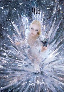 El anuncio de Ángel tiene un claro punto de fuga; el cuerpo de la mujer atrae totalmente la atención; las líneas dirigen el movimiento de nuestra mirada; al ser un primer plano en picado crea un gran efecto de profundidad. Los colores empleados, fundamentalmente azules y blancos, son fríos. Todo ello hace que la imagen sea especialmente estética, creando la sensación de irrealidad, de un halo etéreo, de frescor y candor… cualidades que, sin lugar a dudas, el anunciante quiere que asociemos al uso de este perfume.