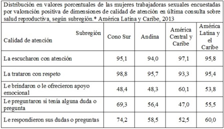 Casi todas las trabajadoras sexuales encuestadas (más del 95%) consideran que en la última consulta sobre salud reproductiva los profesionales las escucharon con atención y las trataron con respeto. Alrededor del 60% sintió que sus preguntas o dudas fueron tomadas en consideración por el profesional (ya sea haciendo lugar a las mismas o respondiéndolas), y poco más de la mitad refirió haber recibido apoyo emocional.