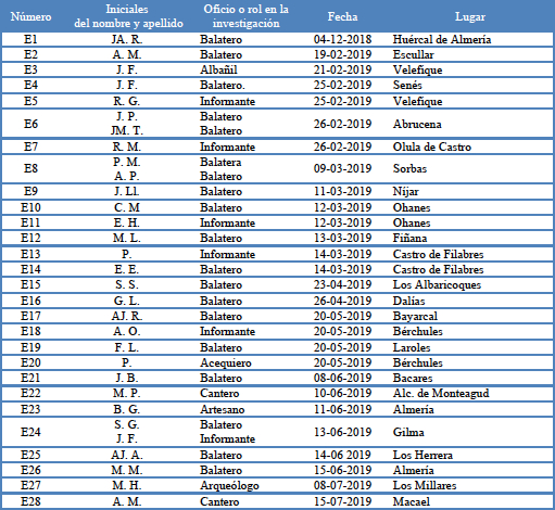 Y, por último, el grueso del trabajo de campo ha estado centrado en la localización de portadores, mediante visitas a diferentes espacios de sociabilidad o de copresencia social en diversas poblaciones: centros sociales, hogares del jubilado, ayuntamientos, plazas públicas, etc. A partir de referencias de personas anónimas o por la intermediación de varios informantes concernidos por el arte y la salvaguardia de la piedra seca o por el desarrollo local en sus respectivos ámbitos, que han actuado de porteros o como guías de campo, pudimos localizar una serie de portadores que se especificarán más adelante. Tanto con estos informantes como con el resto de participantes mantuvimos, al menos, una sesión de entrevista. Entrevistas entendidas como narraciones que ponen énfasis en las estructuras temporal, social y de significado (Kvale 2011), de tal manera que facilitan la construcción de relatos ubicados tanto sincrónica (contextualmente) como diacrónicamente (en la secuencia de cambios y permanencias que constituyen periodos vitales relevantes en la vida de las personas). A pesar de tratarse de entrevistas abiertas, con su correspondiente guion previo, adoptaron en la generalidad de los casos el formato de conversación entre iguales, de tal manera que facilitó la mutua interpelación entre investigador y participante, creando un entorno más atractivo para transmisión de las experiencias por parte de estos. El total de entrevistas realizadas fue de 28, participando un acequiero, un albañil, un arqueólogo, un artesano de la piedra, 19 balateros, dos canteros y los seis informantes a los que ya nos hemos referido. Indicar también que en algunas entrevistas participaron más de una persona, de ahí que aparezcan más participantes que entrevistas.