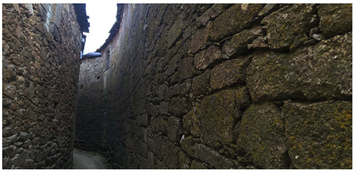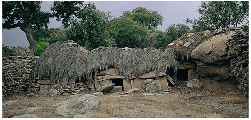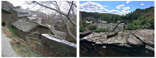 Aun así, debemos hacer alusión a la combinación de las técnicas de piedra seca con otras. De hecho, hay construcciones que se corresponden con estas pero que habitualmente incluyen elementos vegetales en cerramientos o cubiertas. No es un catálogo agotado ya que, en otras ocasiones, se sustituyen las cubiertas vegetales por pétreas en algunas donde la materia prima pétrea es la pizarra laminable, aunque también hay casos en los que usa granito o caliza en falsas bóvedas. Para este fin no vale cualquier pizarra y, de hecho, son escasos los ejemplares fuera del noroeste peninsular (Maldonado y Vela 2014). Las cubiertas de pizarra, en su técnica tradicional, se trazan mediante el ensamblaje simple de piezas más o menos regulares en una caída suave, apoyadas sobre la estructura sustentante de madera con apoyos de piedra en ocasiones, y se rematan habitualmente mediante apoyos de piedra en cumbreras y aleros para evitar que se pueda levantar tan original puzzle. La clave del uso de estas cubiertas pétreas está en la aludida inclinación, la limitada superficie de las construcciones a cubrir y la destreza en el laminado manual del material. Solo en la ejecución de las chimeneas, generalmente como forros de estructuras de adobe frágiles al agua, hemos percibido el uso de algunas ayudas de sujeción mediante espigas de madera o clavos metálicos. Además, incluso en las áreas donde las cubierta han sido de teja árabe, la piedra ha ocupado su en la ejecución de aleros y otros recursos constructivos de nuevo en seco como faldones, muros, bancos, columnas, escalinatas, entradas adinteladas, salientes, etc. (1).