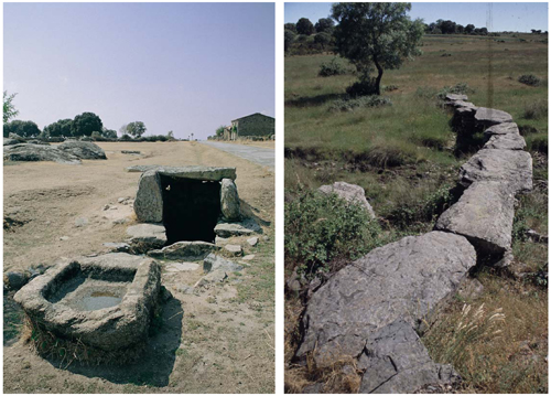 La técnica en seco escogida para la ejecución de la obra popular –hasta el momento amontonamiento y enlosado– no es, a nuestro juicio, relevante en sí misma. A través de los ejemplos que estamos viendo, estas técnicas pueden aparecer solas o combinadas con otras, implicar la disposición más o menos simple de un único elemento pétreo –si es que colocar un mojón puede considerarse un acto simple– o exigir el concurso de un importante esfuerzo, inversión y coordinación colectivas. Esto se aprecia bien en las obras llamadas de ingeniería, caso de las calzadas que acabamos de señalar u otras infraestructuras como las hidráulicas. No haremos un catálogo de las mismas (fuentes, pozos, cigüeñales, lavaderos, abrevaderos, canales, norias, aceñas, pesqueras, puentes, etc), aunque sí incluimos algunos ejemplos que, por su extrema sencillez y por el recurso exclusivo de piedra seca, son significativos para nuestro objetivo.