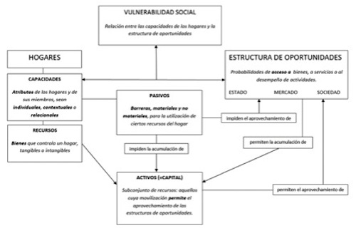 A partir de esta premisa construyen todo un entramado conceptual centrado en la noción de vulnerabilidad social, que conciben como una relación entre dos términos: por una parte, la estructura de oportunidades y, por otra, las capacidades de los hogares(Kaztman y otros 1999: 166). En el siguiente diagrama, de elaboración propia, hemos tratado de representar el desarrollo conceptual (vulnerabilidad social, estructura de oportunidades, capacidades, recursos, activos y pasivos) y la teorización de la vulnerabilidad social del enfoque AVEO: