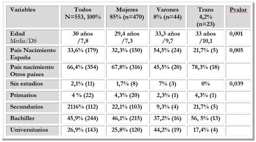 En las tablas 1 y 2 se presentan las características sociodemográficas de la muestra. Las personas que respondieron la encuesta tenían una media de 30 años, el 85,2% eran mujeres, el 8% varones y el 4,2% trans. Más de un tercio de las trabajadoras/es sexuales nacieron en España; sin embargo, la mayoría eran extranjeros/as, con una media de siete años en España.