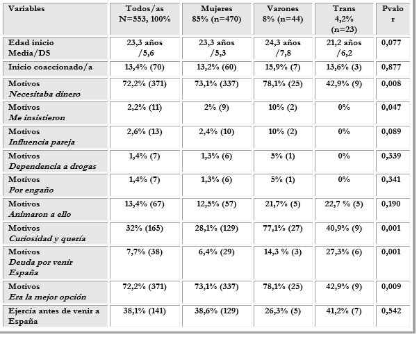 En cuanto al inicio en el trabajo sexual, los resultados obtenidos se han recogido en la tabla 3. La edad media de inicio al trabajo sexual fue a los 23 años y solo el 5,5% (n=27) comenzó siendo menor de edad (11 españolas y 16 extranjeras). El 38% empezó en su país de origen. Para el 13% su iniciación en el trabajo sexual fue por obligación o coacción; por tanto, la mayoría de los/as encuestados/as se iniciaron por decisión propia. Sin embargo, las razones que estaban detrás de esta elección fueron la necesidad de dinero, la curiosidad y quererlo, le animaron a ello, y para pagar la deuda que tenía para venir a España, entre las razones más indicadas. Es interesante destacar que en la muestra analizada más personas trans indicaron iniciarse por una deuda para venir a España frente a los otros dos géneros.