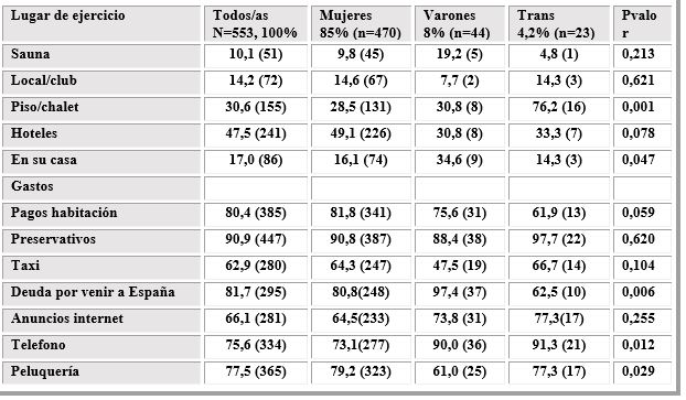 Entre los lugares en los que desarrollaban el trabajo sexual los hombres señalaron en mayor proporción su casa, las personas trans un piso o chalet y en las mujeres los hoteles. En este sentido es posible que los hombres sean más autónomos e independientes que los otros dos géneros, dependiendo menos de terceros para desenvolverse en la actividad. No obstante, este aspecto deberá ser estudiado con mayor profundidad en el futuro, porque la movilidad dentro del trabajo sexual es muy grande (Siegel 2011).