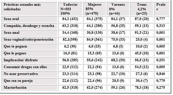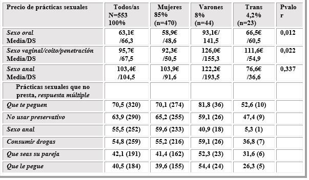 Por último, los servicios que con más frecuencia no estaban dispuestas a realizar las encuestadas fue el sexo con violencia receptivo, no usar preservativo, el sexo anal y el consumo de drogas.