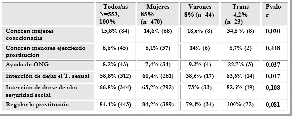 En la tabla 8 se presentan algunas cuestiones preguntadas sobre expectativas o conocimientos de su entorno. En este sentido, el 15,8% conocía a mujeres que estaban o estuvieron coaccionadas y el 8,6% a menores ejerciendo la prostitución. El 8% de toda la muestra había recibido una ayuda de una ONG, siendo más elevado en el grupo de personas trans. Por último, casi el 59% tenía intención de dejar el trabajo sexual, mucho más entre las mujeres, y el 84,4% consideraba que era preciso alguna regulación de la prostitución, así como el 67% estaba dispuesta a darse de alta en la seguridad social si se regulaba, en ambos casos sin diferencias entre los grupos.
