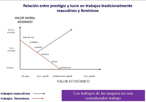Otros estudios sustentan este marco conceptual y han podido influir en dichos planteamientos. En esta línea, Silvia Federici (2004) sostiene que la caza de brujas marcó históricamente la devaluación de la economía de las mujeres, y las llevó a una posición de subordinación respecto a los hombres. En el esquema propuesto por Dolores Juliano (véase la imagen posterior) puede apreciarse de forma didáctica cómo la reorganización de la tarea reproductiva impuesta en el sistema capitalista mantiene la precariedad en las mujeres. Además, ilustra claramente el vértice en que confluye el valor moral que se atribuye a los empleos y su relación con la división sexual del trabajo. En esta articulación de variables, el estigma como rechazo social puede ser asumido por las trabajadoras sexuales, quienes anteponen el lucro económico asumiendo el desprestigio social que ello conlleva.