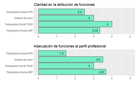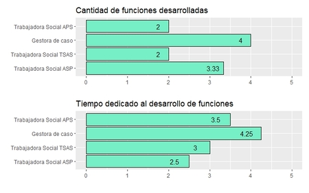 La cantidad de funciones desarrolladas fue valorada por las profesionales encuestadas con un 2,83 de media, siendo las puntuaciones de las trabajadoras sociales de APS y del TSAS las más bajas y representativas de un menor volumen de funciones: “Veo que nuestro papel es mínimo” (Trabajadora social TSAS, entrevista 2).