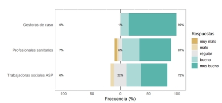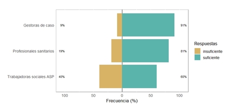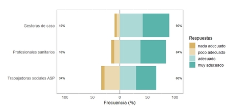 Las personas destinatarias también tuvieron la oportunidad de valorar la atención brindada por las trabajadoras sociales, tanto a través de una encuesta como de entrevistas. Una de las dimensiones valoradas cuantitativamente fue la relativa a la suficiencia de las atenciones (figura 2), en la que se diferencia entre aquellas proporcionadas por las trabajadoras sociales de ASP y las gestoras de caso −como profesionales del trabajo social que, por el rol desempeñado, mantuvieron contacto con todas las personas atendidas−, y por las y los profesionales sanitarias/os, con el objetivo de posibilitar comparativas.