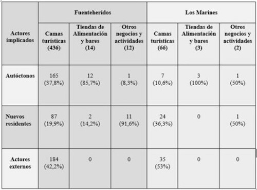 El cuadro presentado a continuación cuantifica los diversos emprendimientos turísticos en Fuenteheridos y Los Marines (alquiler turístico, la restauración y otras actividades) e identifica a los principales actores involucrados en la gestión de cada uno de estos negocios (autóctonos, nuevos residentes y actores externos). En primer lugar, estos datos evidencian diferentes niveles de desarrollo turístico, siendo muy alto en Fuenteheridos y muy bajo en Los Marines. Por otro lado, aunque los niveles de desarrollo sean diferentes, en ambos casos se refleja cómo en el turismo participan actores no autóctonos e incluso no residentes.