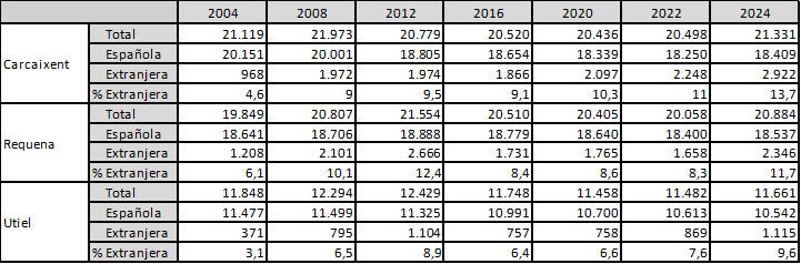 Tabla 1. Evolución de la de la población según nacionalidad en Carcaixent, Requena y Utiel. 2024-2014.